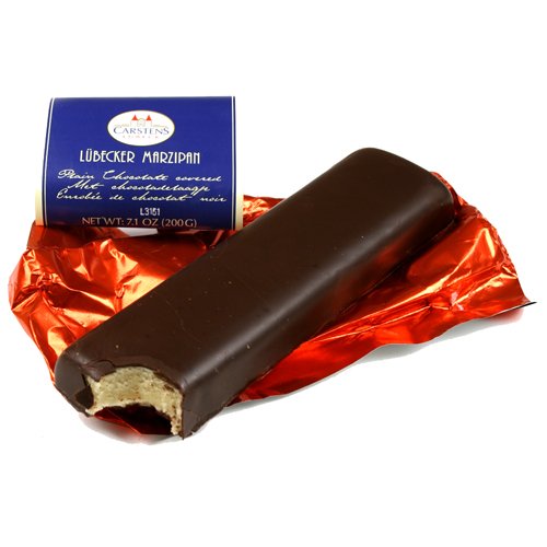 Lubeck, Germany is universally known for its superior chocolate covered marzipan. We offer to all marzipan fans the ultimate delight- a shimmering red-wrapped bar of marzipan enrobed in chocolate.